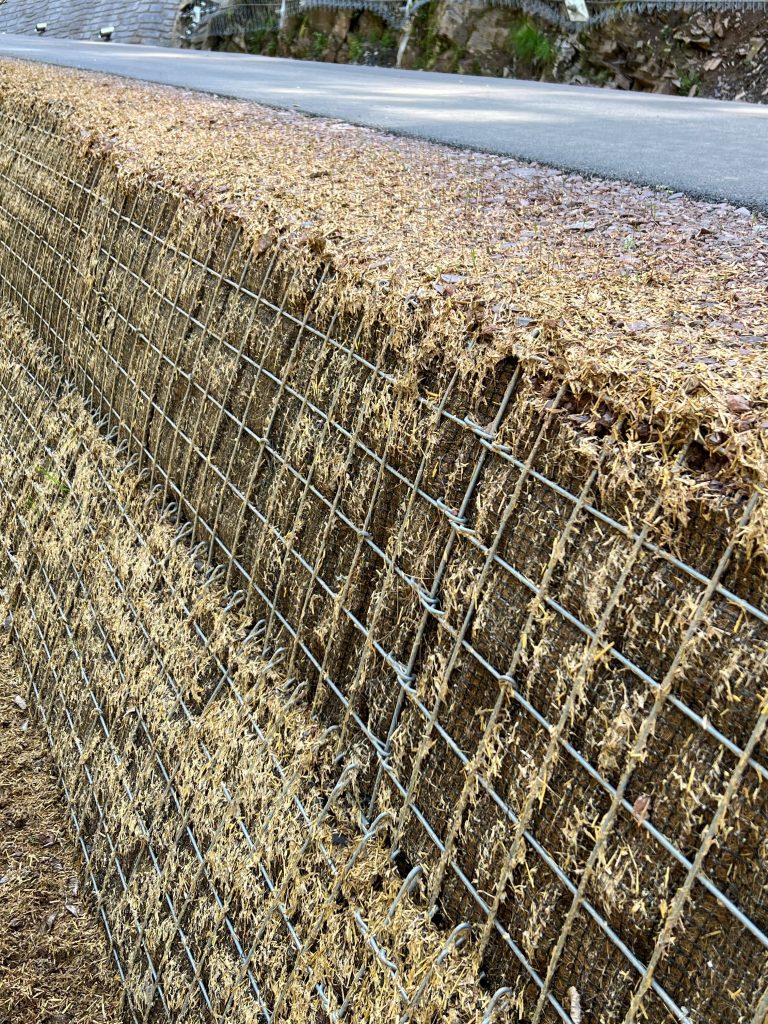 Für die Elemente mit 200 cm Länge, einer Drahtstärke von 5mm und einer Maschung von 10×10 cm wurden punktgeschweißte Drahtgittermatten mit Zink-Aluminium-Beschichtung (95% Zink, 5% Aluminium) verwendet. Zusätzlich kamen Geogitter von TENSAR zum Einsatz, um den Hang zu stabilisieren. So entstand eine Ansichtsfläche von ca. 120 qm, die sich wunderbar in die Eifel-Landschaft einfügt.