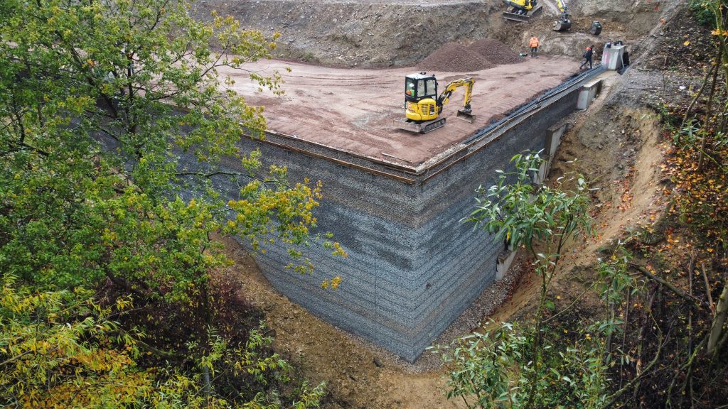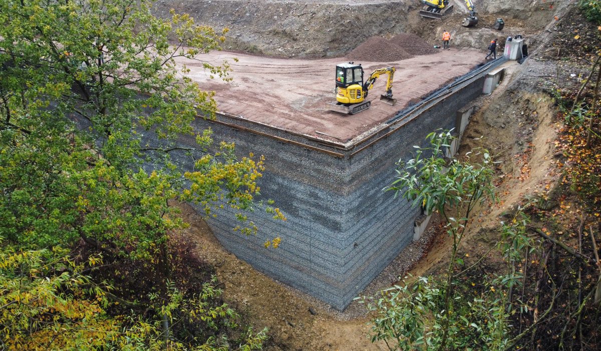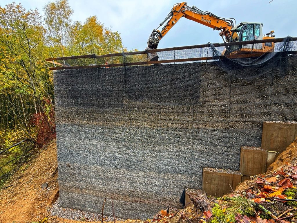 Für die Ausführung wählte unser Kunde GGS TerraCon ein kombiniertes System aus Kunststoff-Bewehrter-Erde (KBE) und einer Gabionenverblendung auf Basis unserer monotec-Stahldrahtgitter. Die Konstruktion erreicht stellenweise beeindruckende 12,50 Meter Höhe und bietet maximale Stabilität bei zugleich schlanker Bauweise.
