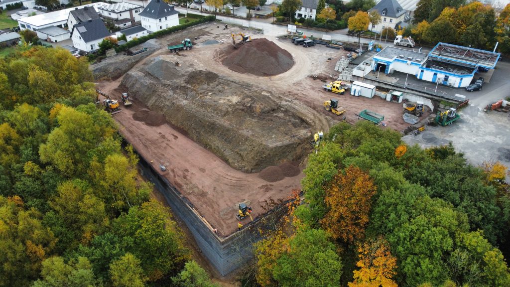 Beim Neubau des Lidl-Marktes in 59929 Brilon stellte die Geländesituation das Projektteam vor besondere Herausforderungen: Große Höhenunterschiede am Baugrund erforderten eine leistungsfähige Stützkonstruktion, die sowohl statisch als auch optisch zur modernen Marktarchitektur passt.