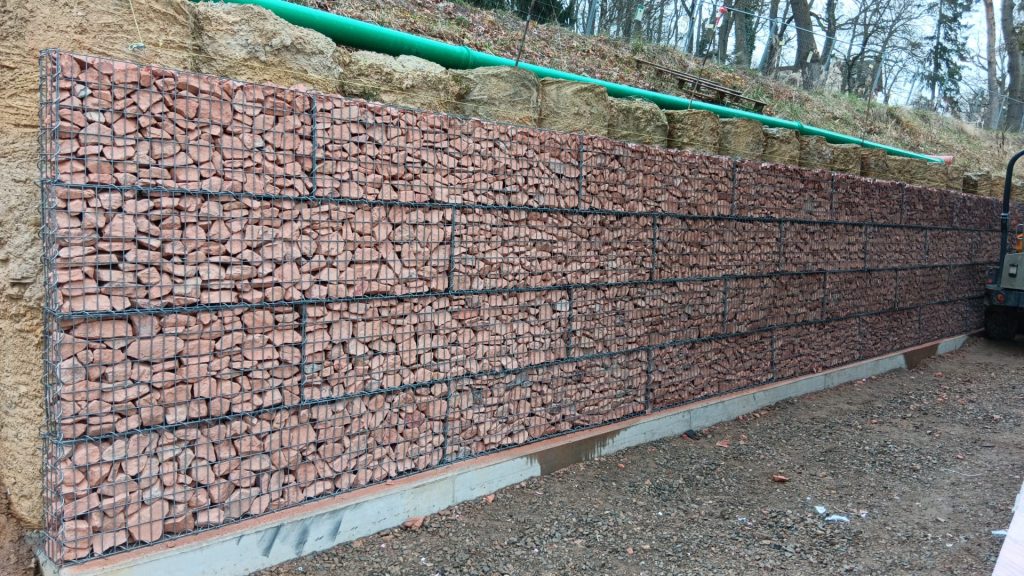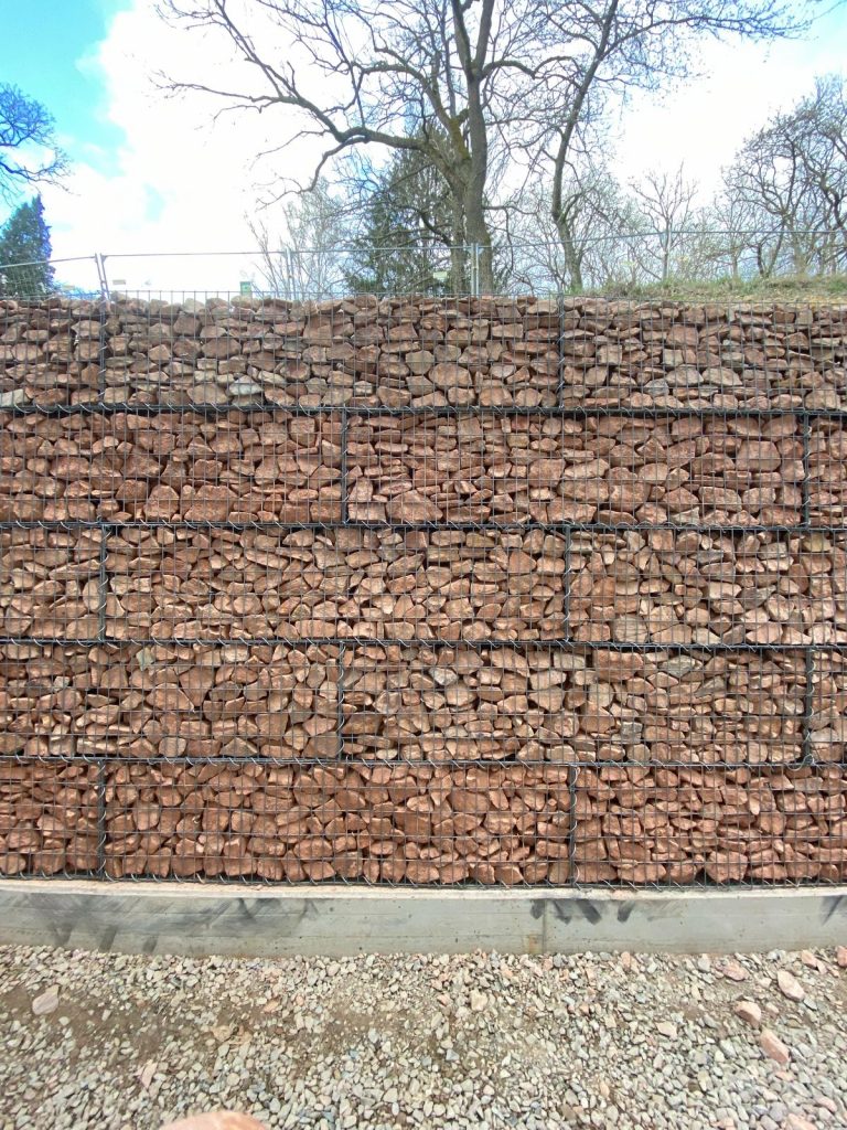 Mit ihrer schlichten, steinbetonten Optik sorgen die Gabionen für eine natürliche Einbindung in die Rheingauer Kulturlandschaft und tragen zur ruhigen, strukturierten Atmosphäre des Klinikareals bei.