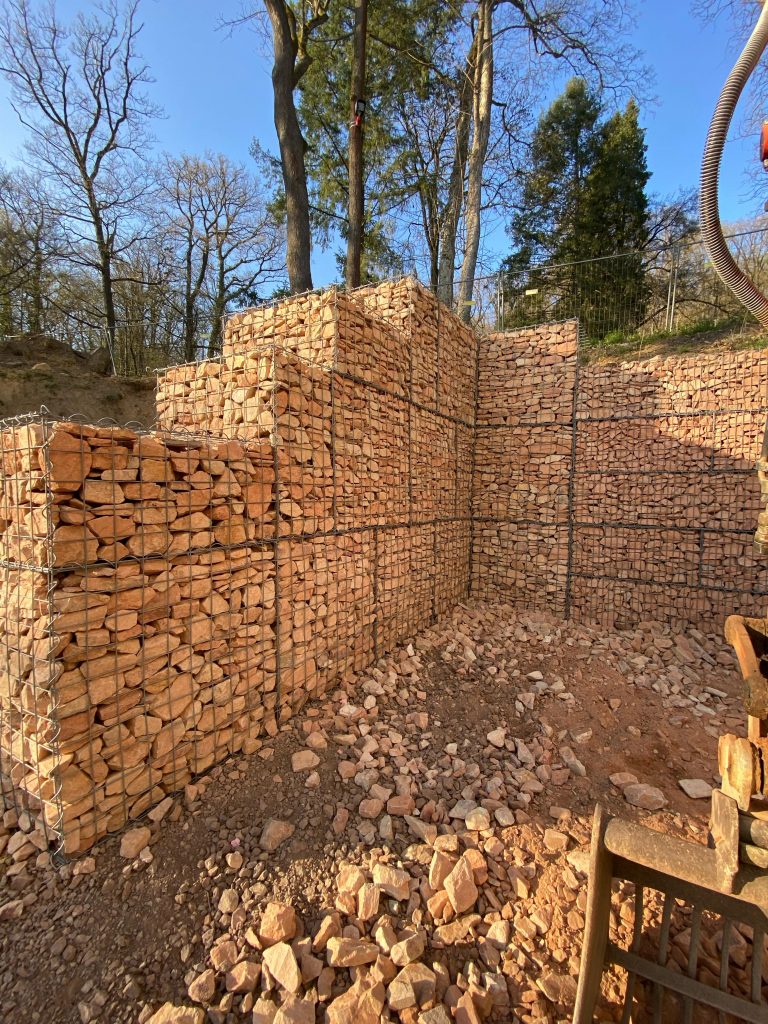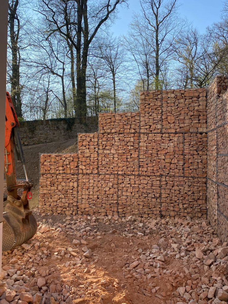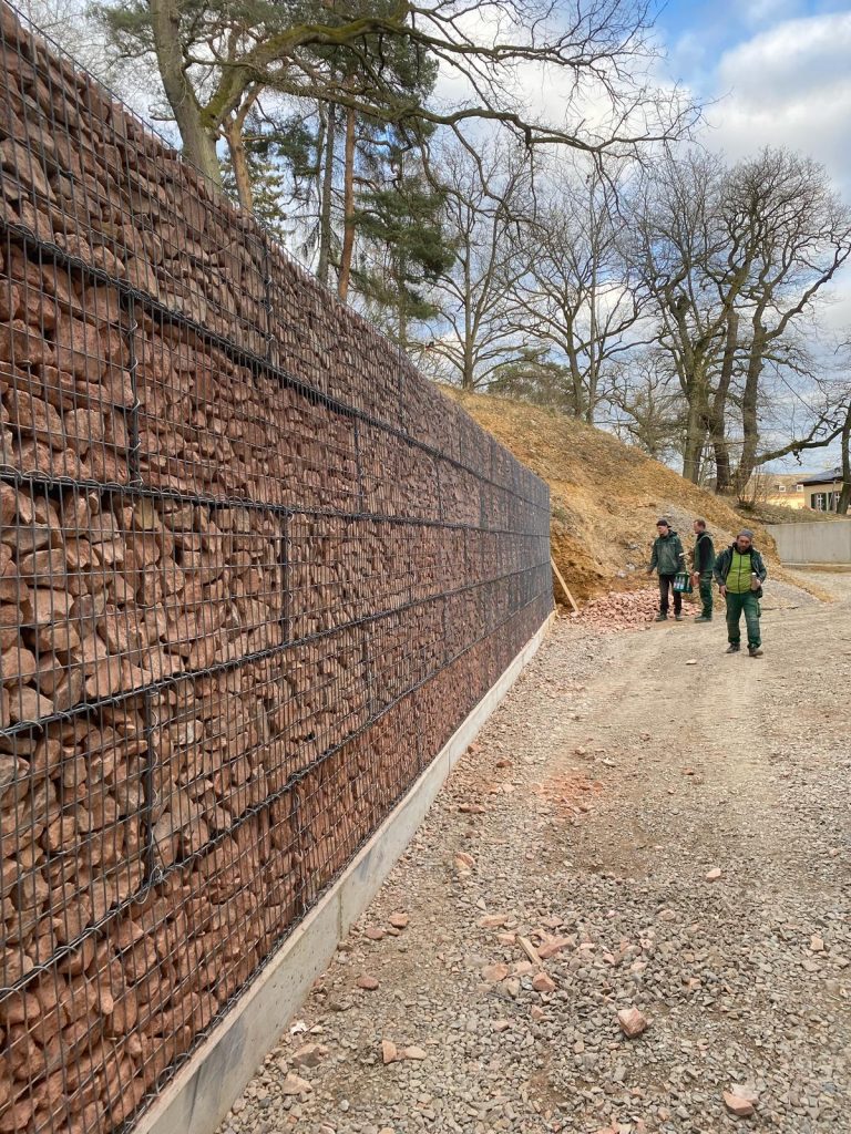 Die Rüppel Bauunternehmung aus Gelnhausen entschied sich gemeinsam mit Kress Gartengestaltung aus Rüdesheim für den Einsatz unserer Roko-Gabionen. Die robusten Drahtkörbe zeichnen sich durch ihre hohe Formstabilität und ihr klares Linienbild aus – ideale Voraussetzungen, um Wegefassungen, Geländesprünge oder Abgrenzungen dezent umzusetzen.